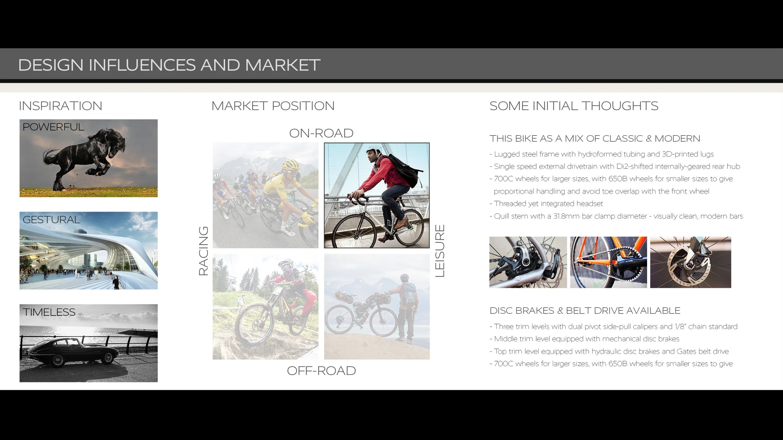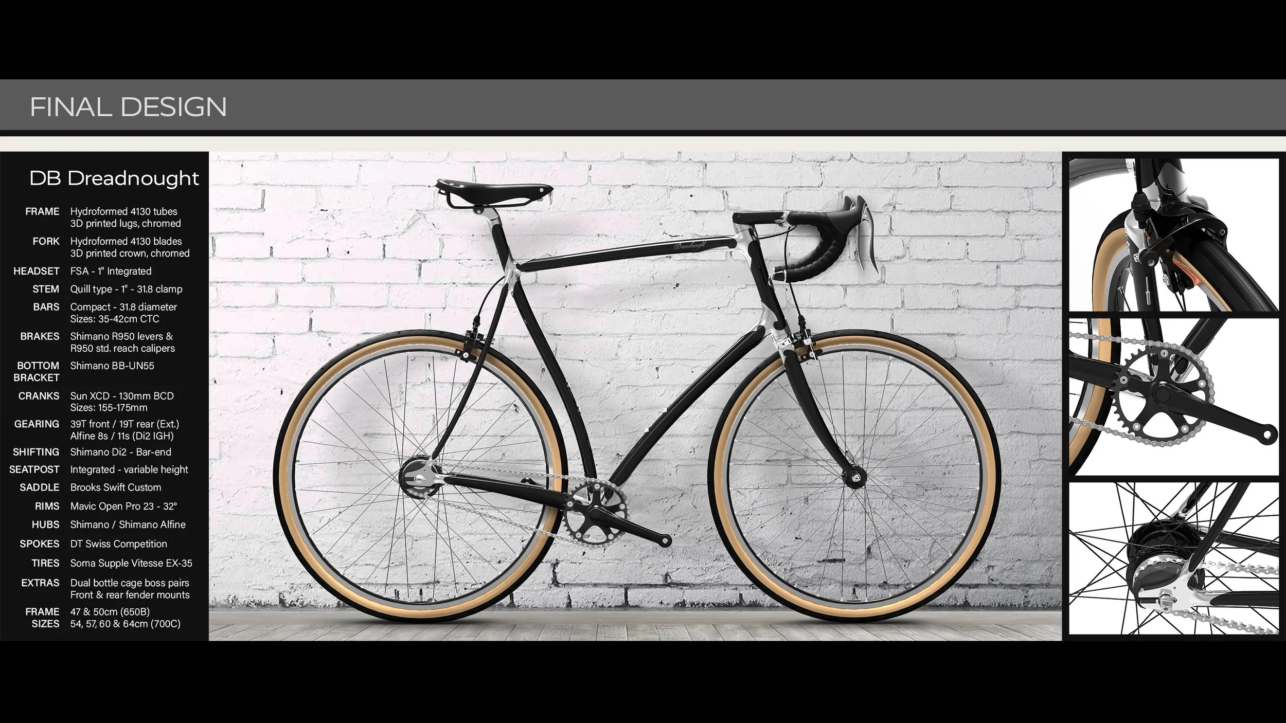 The goal was simple enough: design and all-around bicycle/urban/city commuter with proven components and good tire—and fender—clearance, with modern comfort and fit, possessing a purposeful stance. Plenty of style, inspired by decades of bicycle design, would complete the package to deliver a capable and timeless design, ready to serve its rider well, and look really good doing it.